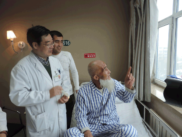 据了解,由于当地风沙浮尘较多、户外紫外线较强的原因,当地农民患白内障、青光眼等眼疾患者较多,因家庭贫困且当地县医院眼科医疗水平有限,很多年纪大的患者也就没能及时治疗。采访中我们得知,大部分的村民都是第一次出远门来乌鲁木齐,当提到艾热姆斯玛时,她的手术医生吴生泉院长说到:“她本身有600度的高度近视,眼底情况不是特别好,手术前她的视力仅有0.06,伸出五指在眼前晃动才有感觉,手术后站在五米地方她能看清视力表第五排,视力恢复效果是非常好的。”