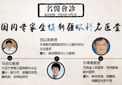 为了满足广大新疆眼病患者的就医需求,5月28日-6月1日,北京大学第三医院眼科主任马志中教授、天津眼科医院斜视与小儿眼科中心岳以英教授、河南省人民医院孙秉基教授将坐镇新疆眼科名医堂,届时广大眼病患者可以不出新疆就享受到国内眼科专家高质量的诊疗服务。