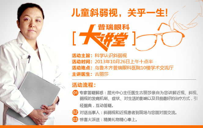 2013年10月26日,乌鲁木齐普瑞眼科医院周末大讲堂,和专家面对面,一起来听专家讲讲“斜视弱视和近视的那些事儿”。在活动现场我们将为您科学讲解斜视、弱视和近视尤其是小儿斜弱视的种种问题,参与此次普瑞周末大讲堂的朋友,不但有机会和专家面对面交流,更有好礼相送。